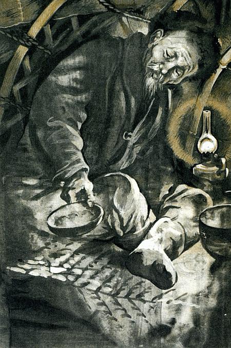 Откинулась войлочная дверь юрты рядом с овчарней. Высунулся Даулет. Позвал Куцего. В юрте сидел Кашкарбай, ел. Даулет принёс собачью миску, наполнил кашей, сваренной с сушёным мясом. Куцый жадно сунулся в миску, но Кашкарбай отнял её. Ногой вытолкал Куцего из юрты, поставил миску в снег и сказал: