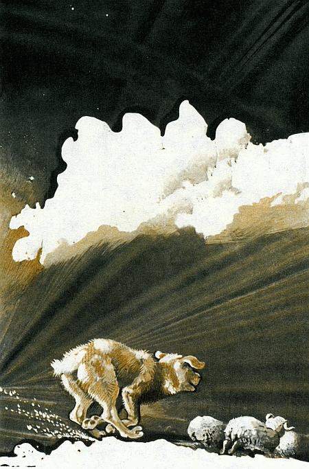 Куцый выгнал троицу к овчарне в глубоких сумерках. Пёстрый, увидев, что не Красный гонит троицу, а щенок, подскочил было к барану, чтобы «добавить» ему. Но оскалился на пса Куцый — не мешай, мол, — и в смущенье отошёл Пёстрый.