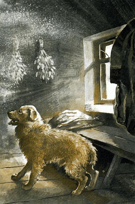 Куцый кинулся в распахнутую дверь. Горячий и плотный воздух оглушил его, обжёг ноздри. Сквозь слёзы, как сквозь туман, Куцый увидел под потолком хозяина и банщика. Его хозяина хлестали веником, он корчился и увёртывался!…