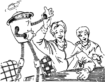 Норби, знаменитый робот-путаник, встал из-за стола, чтобы прочитать свое стихотворение. Его телескопические ноги вытянулись на всю длину, руки с двусторонними ладонями были сложены перед бочкообразным корпусом. Из-под полей его металлической шляпы выглядывали широко раскрытые глаза — два сзади и два спереди.