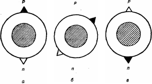 Рис.9 Волшебная ручка с двумя указателями позволяет описать взаимное превращение протонов и нейтронов. Черный указатель действует, как и на рис. 8, а светлый – описывает превращение всех нейтронов в протоны. Случай а соответствует реально наблюдаемому соотношению числа протонов и нейтронов. В случае б протоны частично переходят в нейтроны, а нейтроны – в равной степени в протоны. Когда ручка перейдет в положение в, все исходные протоны превратятся в нейтроны, а все нейтроны—в протоны. Вследствие фундаментальной симметрии ядерные силы не зависят от положения волшебной ручки.