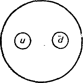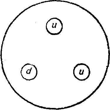 Основная идея этой теории очень проста. Все адроны построены из более мелких частиц, называемых кварками. Кварки могут соединяться друг с другом одним из двух возможных способов: либо тройками, либо парами кварк—антикварк. Из трех кварков состоят сравнительно тяжелые частицы – барионы, что означает “тяжелые частицы”. Наиболее известны из барионов нейтрон и протон. Более легкие пары кварк—антикварк образуют частицы, получившие название мезоны — “промежуточные частицы”. Выбор такого наименования объясняется тем, что первые обнаруженные мезоны занимали по массе промежуточное положение между электронами и протонами. Чтобы учесть все известные тогда адроны, Гелл-Манн и Цвейг ввели три различных типа (“аромата”) кварков, получивших довольно причудливые названия: и (от up — верхний), d (от down — нижний) и s (от strange – странный). Допуская возможность различных комбинаций ароматов, можно объяснить существование большого числа адронов. Например, протон состоит из двух и- и одного d-кварков (рис, 10), а нейтрон – из двух d-кварков и одного u-кварка.