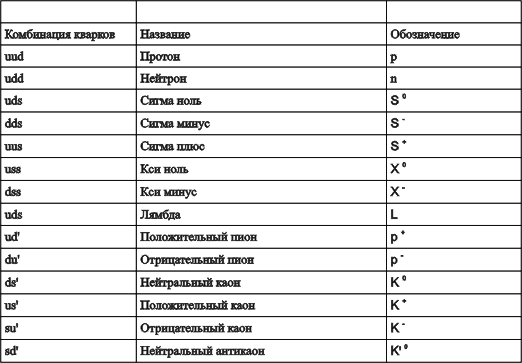 В табл. 2 представлены различные возможные комбинации кварков с тремя ароматами и указаны их названия (обычно просто греческая буква). Многочисленные возбужденные состояния не приведены. То обстоятельство, что из различных комбинаций трех основных частиц можно получить все известные адроны, символизировало главный триумф теории кварков. Но несмотря на этот успех, лишь через несколько лет удалось получить прямые физические доказательства существования кварков.