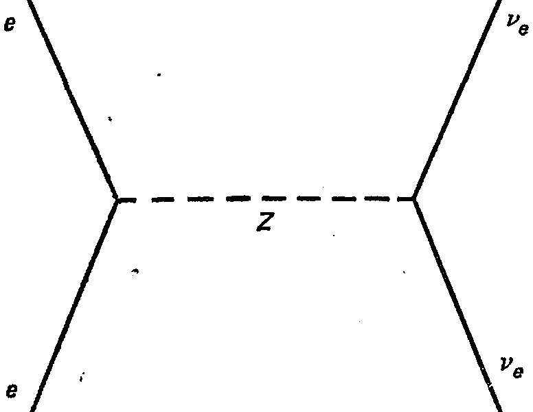 Рис.18. Теория Ваинберга—Салама предсказывает, что электроны могут рассеивать нейтрино, обмениваясь с ними электрически нейтральным переносчиком слабого взаимодействия – промежуточным векторным бозоном Z. Экспериментальное подтверждение такого процесса было получено в середине 70-х годов,