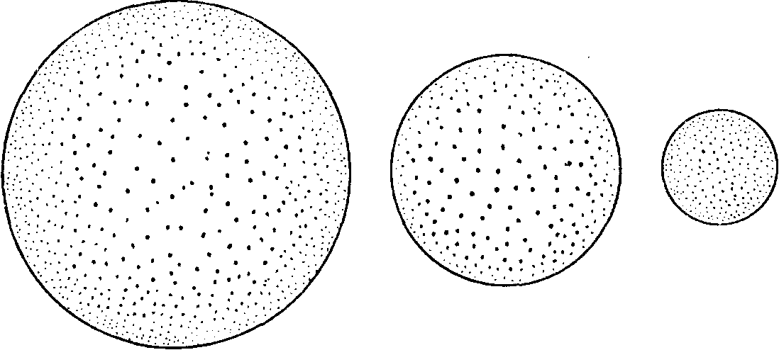 Рис.1. Расширяющаяся Вселенная похожа на раздувающийся шар. Точки, изображающие галактики, разбросаны по поверхности шара более или менее равномерно. Когда шар раздувается, расстояния между “галактиками” увеличиваются. Наблюдателю, находящемуся в любой из точек кажется, будто соседние точки удаляются, хотя в действительности они не движутся по поверхности: совокупность “галактик” вовсе не разбегается относительно какой-либо точки на поверхности. Разумеется, двумерная поверхность шара – не более, чем аналог трехмерного пространства. В реальной Вселенной не существует области, соответствующей областям внутри или снаружи оболочки шара.