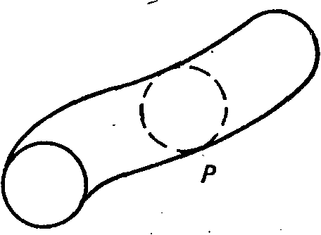 Рис. 27. С большого расстояния трубка кажется волнистой линией. При ближайшем рассмотрении точка Р на этой линии оказывается окружностью поверхности трубки. Возможно, что объект, обычно воспринимаемый нами как точка в трехмерном пространстве, в действительности представляет собой крошечную окружность в других измерениях пространства. Эта идея лежит в основе теории Ка-луцы—Клейна, объединяющей электромагнитное и гравитационное взаимодействия.