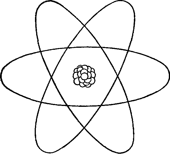 Рис. 2. Схематическое изображение атома. Центральное ядро имеет вид шара, состоящего из сильно связанных протонов и нейтронов и окруженного облаком обращающихся вокруг него электронов. Почти вся масса атома сосредоточена в ядре. Из-за квантовых эффектов орбиты электронов на самом деле не соответствуют четко определенным траекториям, показанным на рисунке.