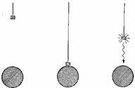 Рис. 31. Добыча энергии из черной дыры. Пустой ящик опускается к поверхности черной дыры. Затем он открывается и заполняется интенсивным тепловым излучением черной дыры. После этого ящик удаляется, а тепловая энергия используется. Добытая энергия оплачивается потоком отрицательной энергии, излучаемой отражающей нижней поверхностью ящика в черную дыру. При этом энергия черной дыры (а тем самым ее масса и размеры) уменьшается. Таким образом осуществляется эффективная добыча энергии, содержащейся в черной дыре в виде ее массы.