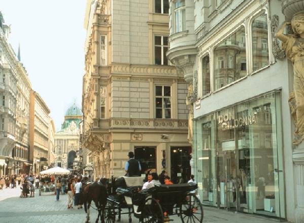 Большая треугольная площадка *Фрайюнга (Freyung) (27)выглядит и сегодня так же, как на знаменитом виде города, запечатленном Каналетто. Примечательны здесь фонтан «Австрия»(1846 г.), украшенный аллегорическими изображениями рек По, Эльбы, Вислы и Дуная, барочный дворец Кински(дом № 4), украшенный великолепным фасадом, и дворец Харраха(дом № 6), построенный в XVII столетии, а также дворец Хардегга(1847 г), что находится рядом с дворцом Ферстеля (см. ниже). На Фрайюнге часто организуются небольшие крестьянские рынки и каждый год – обязательно – пасхальные и рождественские ярмарки.