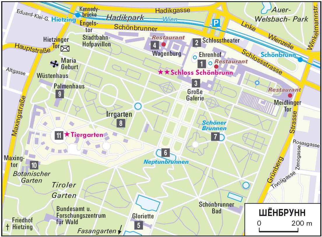 Если вы поедете в Шенбруннский зверинец на метро, то выходите на станции Хитцинг (Hietzing) и не забудьте взглянуть на великолепный придворный станционный павильон Штадтбан-Хофпавильон (Stadtbahn-Hofpavillon) (57). Расположенный непосредственно у реки Вены, он был построен в 1894-1898 гг Отто Вагнером специально для императорского двора и оснащен великолепным куполом и коваными воротами. Здесь император Франц-Иосиф садился в вагон тогдашней «городской дороги» (Stadtbahn), предшественницы венского метро. Теперь Хофпавильон вместе с Императорским залом ожиданияявляется филиалом Исторического музея.