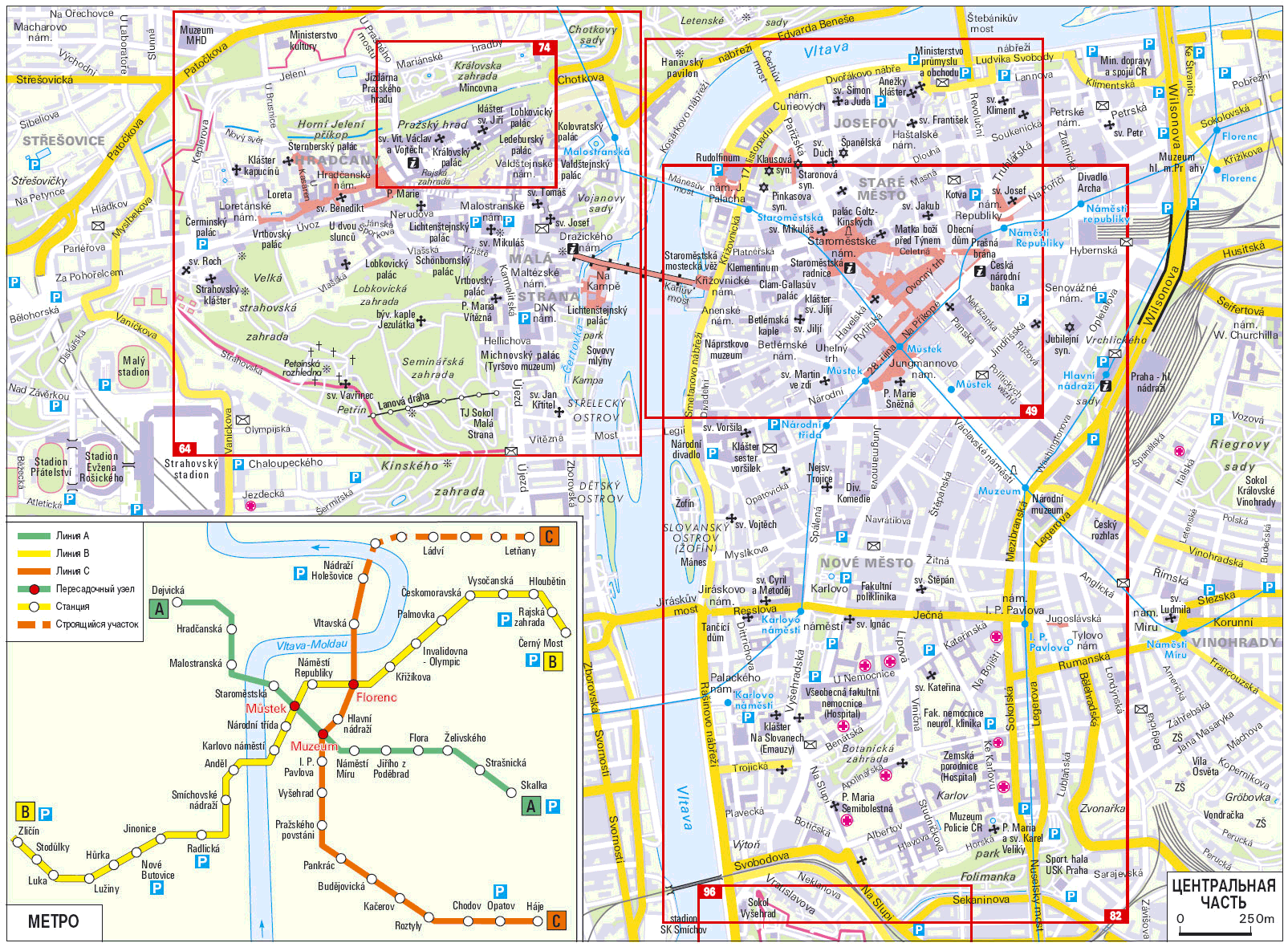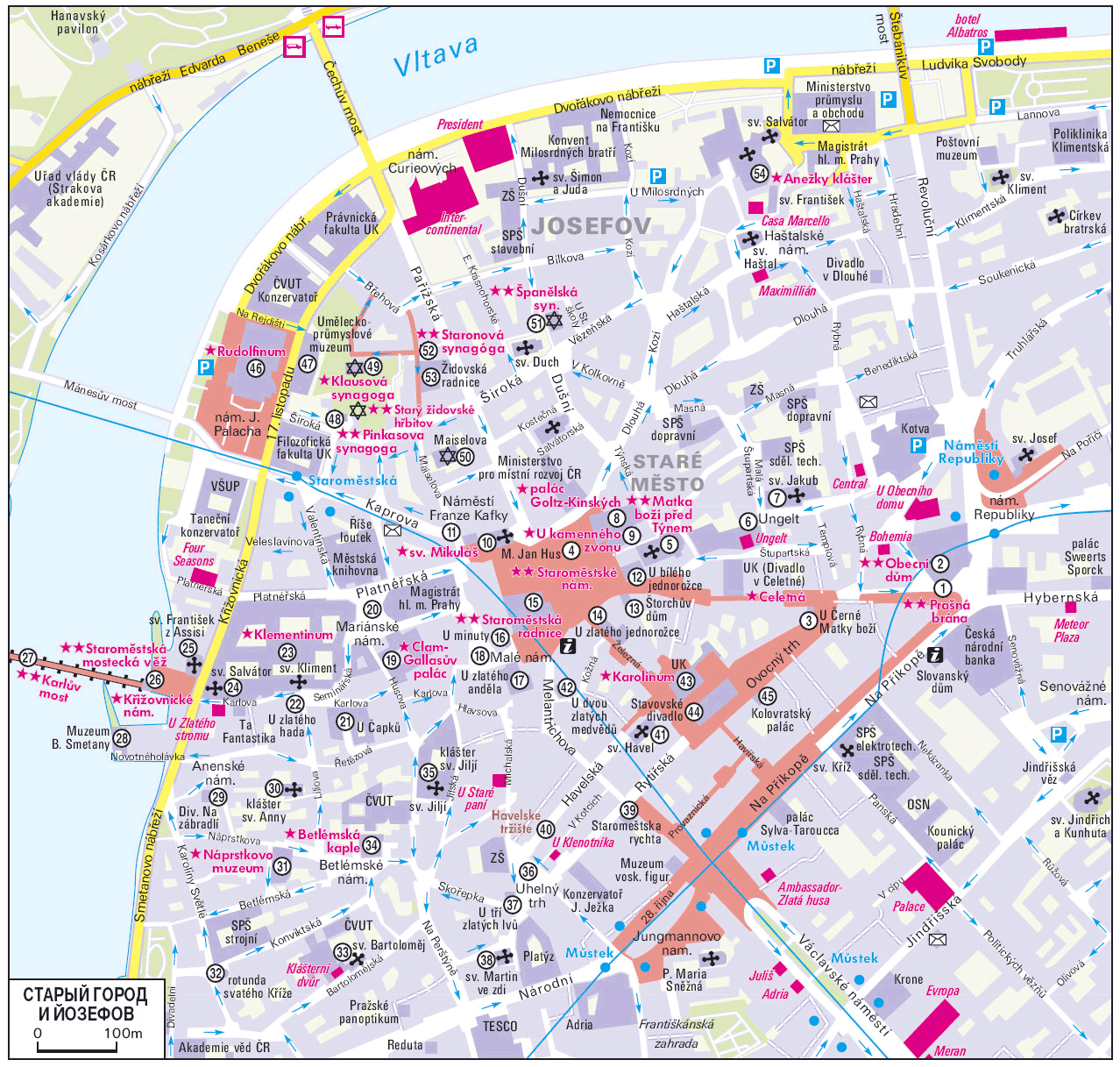 * Целетна улица (Celetn'a)ведёт от Пороховой башни к Староместской площади. Эту оживлённую пешеходную зону украшает множество барочных зданий с богато отделанными фасадами. В доме «У трёх королей» (U tr'i kr'alu)с 1896 по 1907 гг. жил Франц Кафка. Кубистский угловой дом «У Чёрной Богородицы» (3)(U Cern'e Matky boz'i;№ 34), построенный Йозефом Гочаром в 1912 году, тоже выглядит очень фотогенично. В этом доме находится выставка кубизмаНациональной галереи.