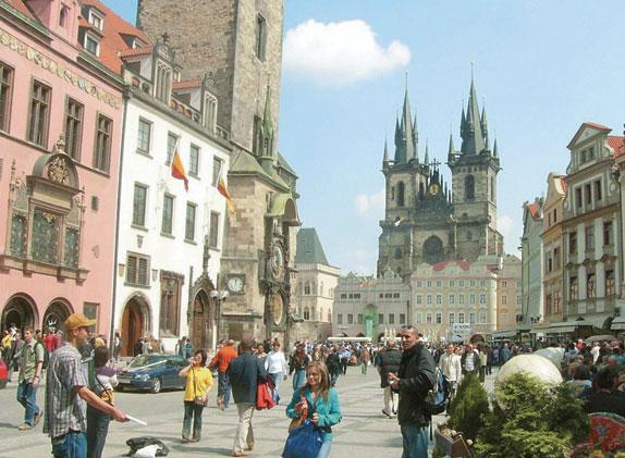 Староместская площадь со Староместской ратушей (слева) и храмом Девы Марии перед Тыном (в центре).
