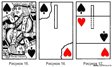 Можно одну карту превратить в другую или изменить ее масть. Например, король пик может стать королем червей. Для этого необходимо только изменить очко в углу карты. Этого можно достичь при помощи двойной карты. В этом случае вырезается та часть средней стороны, на которой должно быть очко. Задняя карта приклеивается к передней только по краям, она совершенно белая, только в ее верхнем углу находится очко, например, пиковое. Это очко будет видно а отверстии, сделанном в верхней карте, и благодаря этому карта изменит свою масть.