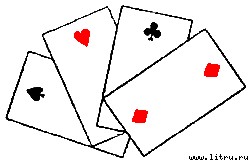 Опять кладете двойку бубен вместо восьмерки треф, трогаете что-нибудь красное и переворачиваете карты, как на рисунке 22. Снова положив восьмерку треф на место двойки бубен, вы кладете четыре карты опять в колоду, делаете вольт, чтобы все заготовленные карты оказались внизу, а обычные восьмерки легли сверху.
