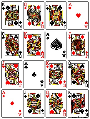 Как расположить тузы и фигуры в четыре ряда так, чтобы ни в одном направлении не было двух одинаковых карт по масти и значению