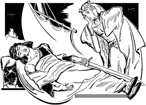 Вдруг вдали показалась ладья. Тихо-тихо скользила она по воде. Сидели в ней женщины в чёрных плащах и капюшонах, и были среди них три королевы, увенчанные золотыми коронами.