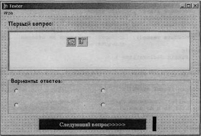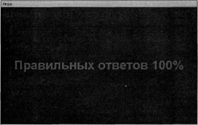 После проверки правильности ответа на последний вопрос, мы прячем почти все компоненты на форме, оставляя видимой только метку Label2 для вывода результата и меню, чтобы можно было продолжить работу с программой. С помощью метки мы отображаем процент правильных ответов пользователя по формуле: "количество правильных ответов * (100 / количество заданных вопросов)". Пример отображения результата теста представлен на рис. 13.3.