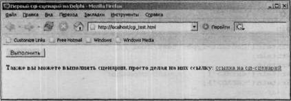 Для того чтобы протестировать сценарий, необходимо переписать рассмотренные выше файлы на сервер с поддержкой CGI или установить и настроить собственный Web-сервер (например, Apache). Открыв показанную Web-страницу, следует нажать кнопку Выполнить или щелкнуть мышью на ссылке.