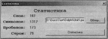 Сначала мы проверяем, существует ли файл, статистику которого будем определять. Если все нормально, то начинаем считывать из этого файла по одному символу и проверять по коду, что это за символ. Если код символа равен 32, то это — пробел, и мы пополняем счетчик пробелов. Если код считанного символа равен 13, то это — символ перевода строки, и мы пополняем счетчик строк. Если считанный символ не является пробелом или символом перевода строки, то это — обычный символ и следует пополнить счетчик символов. Для того чтобы подсчитать количество слов, мы выполняем следующую проверку: если считан пробел или символ перевода строки, то проверяем, является ли предыдущий символ пробелом или символом перевода строки, и если это так, пополняем счетчик слов.