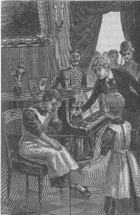 Тут, быстро отбежав от своего старого друга, Наташа схватила за руку сгоравшую со стыда Дуню и насильно вытащила ее вперед.