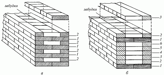 Рис. 16. Системы перевязки: а – однорядная (цепная); б – многорядная; 1 – тычковый ряд; 2–6 – ложковые ряды
