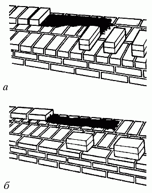 Многорядная перевязка (рис. 16, б). При ней кладка состоит из отдельных стенок толщиной 1/4 кирпича (120 мм), сложенных из ложков и перевязанных через несколько рядов по высоте тычковым рядом. В зависимости от размеров кирпича установлена максимальная высота ложковой кладки между тычковыми рядами для различных видов кладки: из одинарного кирпича толщиной 65 мм – 1 тычковый ряд на 6 рядов кладки; из утолщенного кирпича толщиной 88 мм – 1 тычковый ряд на 5 рядов кладки.