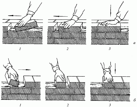 Рис. 20. Кладка способом вприсык ложкового (а) и тычкового (б) рядов наружной версты: 1–3 – последовательность действий