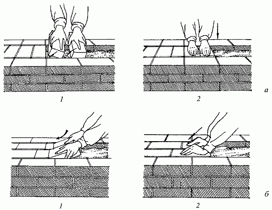 Рис. 21. Кладка забутки способом вполуприсык: а – тычками; б – ложками; 1–2 – последовательность действий
