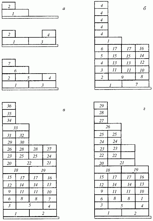 Кладка может осуществляться порядным, ступенчатым и смешанным способом. Последовательность кладки показана на рис. 22 цифрами.