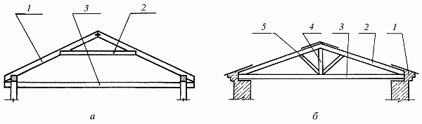 Рис. 28. Стропила: а – наслонные: 1 – стропильная нога; 2 – ригель; 3 – чердачное перекрытие; б – висячие: 1 – мауэрлат; 2 – стропильная нога; 3 – затяжка; 4 – бабка; 5 – подкос
