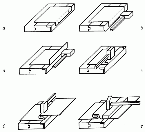 Картина, как правило, состоит из 1–2 листов, края которых подготовлены для фальцевых соединений (рис. 34). Удобнее всего работы по изготовлению картин вести на верстаке длиной 2 м и шириной 1 м с левым краем, выполненным в виде уголка. По внешнему виду фальцевые соединения делятся на лежачие и стоячие, а по степени уплотнения – на одинарные и двойные.