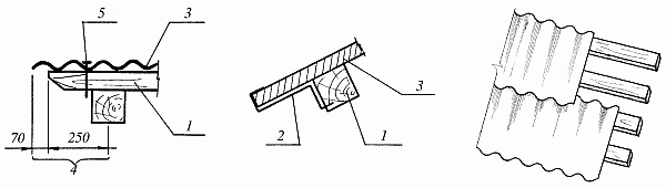 Рис. 40. Крепление асбестоцементных волнистых листов: 1 – бруски; 2 – скоба; 3 – лист; 4 – свес фронтона; 5 – гвоздь