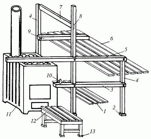 Рис. 57. Стационарные опоры для полков и ограждения печи: 1 – нижний полок; 2 – упоры деревянные; 3 – нижняя перекладина; 4 – пристенные стойки; 5 – верхняя перекладина; 6 – верхний полок; 7 – перила; 8 – средняя стойка; 9 – пристенная перекладина; 10 – штифт; 11 – печь; 12 – низкая скамейка; 13 – резиновые подкладки