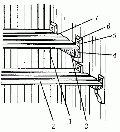 Рис. 58. Полки с опорой на стене: 1 – верхний полок; 2 – нижний полок; 3 – опорная планка; 4 – опорный брус полка; 5 – упоры; 6 – винты; 7 – выступающий конец доски для фиксации полка
