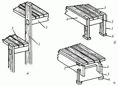 Рис. 59. Конструктивные элементы полков, скамейки и лежанки: а – полки; б – скамейка; в – лежанка; 1 – стойка; 2 – опорный брус; 3 – доски; 4 – рамный брус; 5 – опора; 6 – подкладка