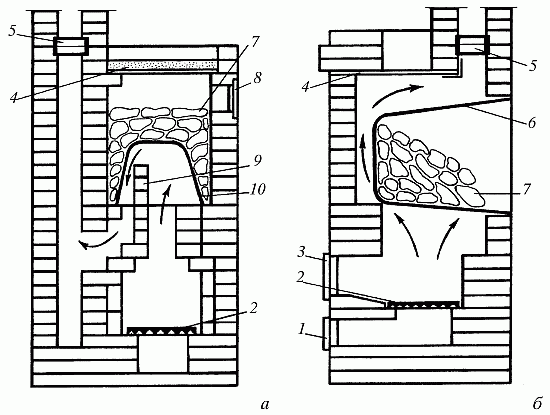 Рис. 63. Кирпичные печи-каменки без водонагревателя: а – с использованием металлического ящика; б – с использованием отработанного котла; 1 – дверка поддувала; 2 – колосниковая решетка; 3 – дверка топливника; 4 – плита; 5 – задвижка; 6 – металлический ящик; 7 – камни; 8 – дверка для пара; 9 – огнеупорные кирпичи; 10 – котел