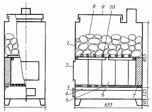 Рис. 64. Металлическая печь-каменка периодического действия: 1 – корпус; 2, 3 – дверки; 4 – полка; 5 – колосниковые решетки; 6 – плита; 7 – кирпичи; 8 – камни; 9 – крышка; 10 – стальная решетка