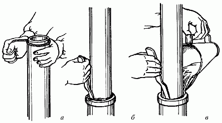 Рис. 78. Заделка стыков канализационных труб: а – навить уплотнение; б – утрамбовать уплотнение; в – залить раструб асбоцементным раствором