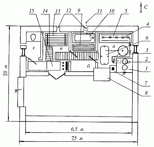 Рис. 79. План бани под домом: а – парная; б – моечная; в – предбанник; г – туалет. 1 – печь-каменка; 2 – котел для подогрева воды; 3 – бочка; 4 – труба-радиатор; 5 – двойной потолок; 6 – надувной матрац; 7 – стояк-дымоход; 8 – фундамент под печь на первом этаже; 9 – решетки; 10 – ванна-душ; 11 – подвод холодной воды; 12 – продухи в фундаменте; 13 – возвышение; 14 – наклонная лестница – спуск с первого этажа; 15 – пульт управления ТЭНами, колодезным насосом, вентиляторами и освещением