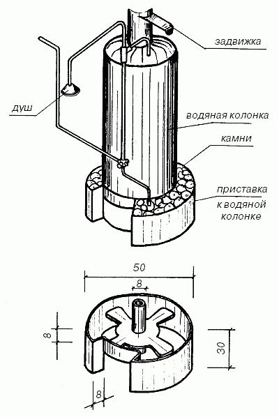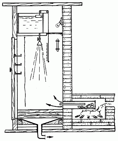 Такая баня-душ чрезвычайно удобна и экономична. Вода для душа нагревается в ней за 15 минут, и требуется для этого всего около 2 кг дров. Кроме того, вода в колонке долго не остывает и остается горячей в течение целого дня. Душ можно пристроить к бане, тогда печь-каменка будет не только нагревать воду для душа, но и обогревать само помещение. Если стены душа хорошо утеплить, это позволит вам пользоваться им круглый год. Душ можно пристроить не только к бане, но и к дому, если в нем имеется печка. Чтобы помещение душа хорошо прогревалось, пристраивать его надо к той стене бани, возле которой находится печка.