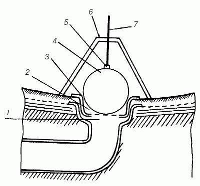 Рис. 82. Устройство затвора для выпускной трубы: 1 – горловина трубы; 2 – дно бассейна; 3 – миска (сетка); 4 – мяч; 5 – ушко; 6 – треножник; 7 – тросик