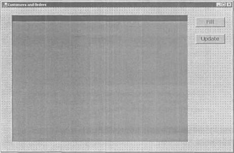 6. Перетащите в форму кнопку и в окне Properties укажите значение bntFill для ее свойства (Name) и Fill для свойства Text; перетащите в форму кнопку и в окне Properties укажите значение bntUpdate для ее свойства (Name) и значение Update для свойства Text; перетащите в форму сетку данных и в окне Properties укажите значение grdCustomersOrders для ее свойства (Name).