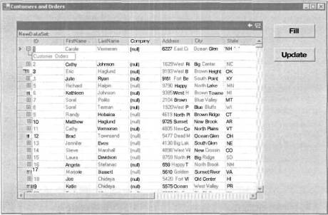 После вставки данных в набор данных ds между таблицами Customers и Orders создается отношение DataRelation, где Customers является родительской таблицей, a Orders — дочерней. Последняя строка кода в этой подпрограмме связывает набор данных DataSet с сеткой для отображения данных.