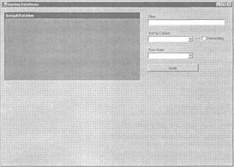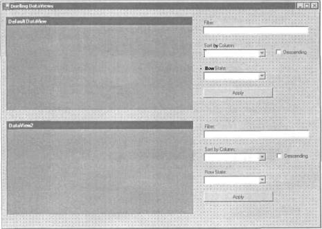 Рассмотрим теперь, как описанные выше идеи применяются на практике. Создайте новую форму frmDataViews в проекте DataSetCode (готовая версия этой формы находится в каталоге с примерами главы 5, "ADO.NET: объект DataSet") для создания двух разных представлений одной таблицы Customers. Каждый объект DataGrid отображает данные представления и содержит кнопки управления сортировкой и фильтрацией. Для этого выполните перечисленные ниже действия.