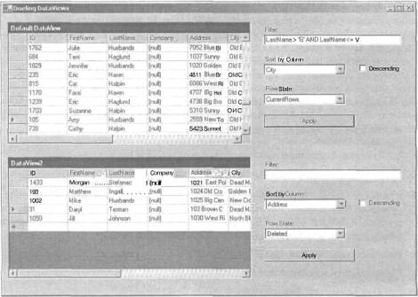 Скомпонуем проект DataSetCode и запустим полученное приложение. Щелкните на кнопке Data Views для отображения новой формы frmDataViews. Внесите необходимые изменения в критерии сетки и щелкните на кнопке Apply для внесения этих изменений в соответствующую сетку. На рис. 7.4 показан пример отображения данных из одной таблицы в двух разных представлениях.