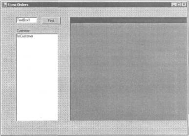 7. В верхнем левом углу формы создайте текстовое поле и укажите значение txtCustomerID для его свойства (Name), создайте кнопку и укажите значение btnFinds для ее свойства (Name) и значение Find для ее свойства Text, создайте поле со списком и укажите значение lstCustomer с для его свойства (Name). В правой части формы создайте сетку данных и укажите значение grdOrders для ее свойства (Name).