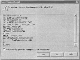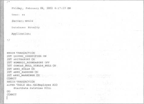 РИС. 8.7. Диалоговое окна Save Change Script с содержимым сценария вставки поля StartDate в таблицу tblEmployee
