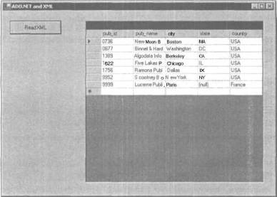 Эта подпрограмма считывает XML-данные из файла pubs.xml в объект DataSet. Теперь объект DataSet и его данные могут использоваться любым из способов, описанных в предыдущих главах. Кроме того, эта подпрограмма связывает объект DataSet с сеткой данных DataGrid. В листинге 10.2 показано содержимое файла pubs.xml, а на рис. 10.1 — данные в сетке DataGrid.
