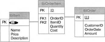 РИС. 1.13. В этой группе таблиц, участвующих в отношении многие-ко-многим, tbIOrderItem является таблицей соединения