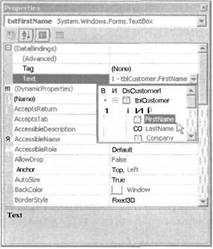 4. Выберите поле FirstName таблицы tblCustomer для свойства Text текстового поля txtFirstName. Для этого щелкните в правой части поля со списком возле свойства Text. Выберите набор данных DsCustomer1, таблицу tblCustomer и поле FirstName, как показано на рис. 1.14.